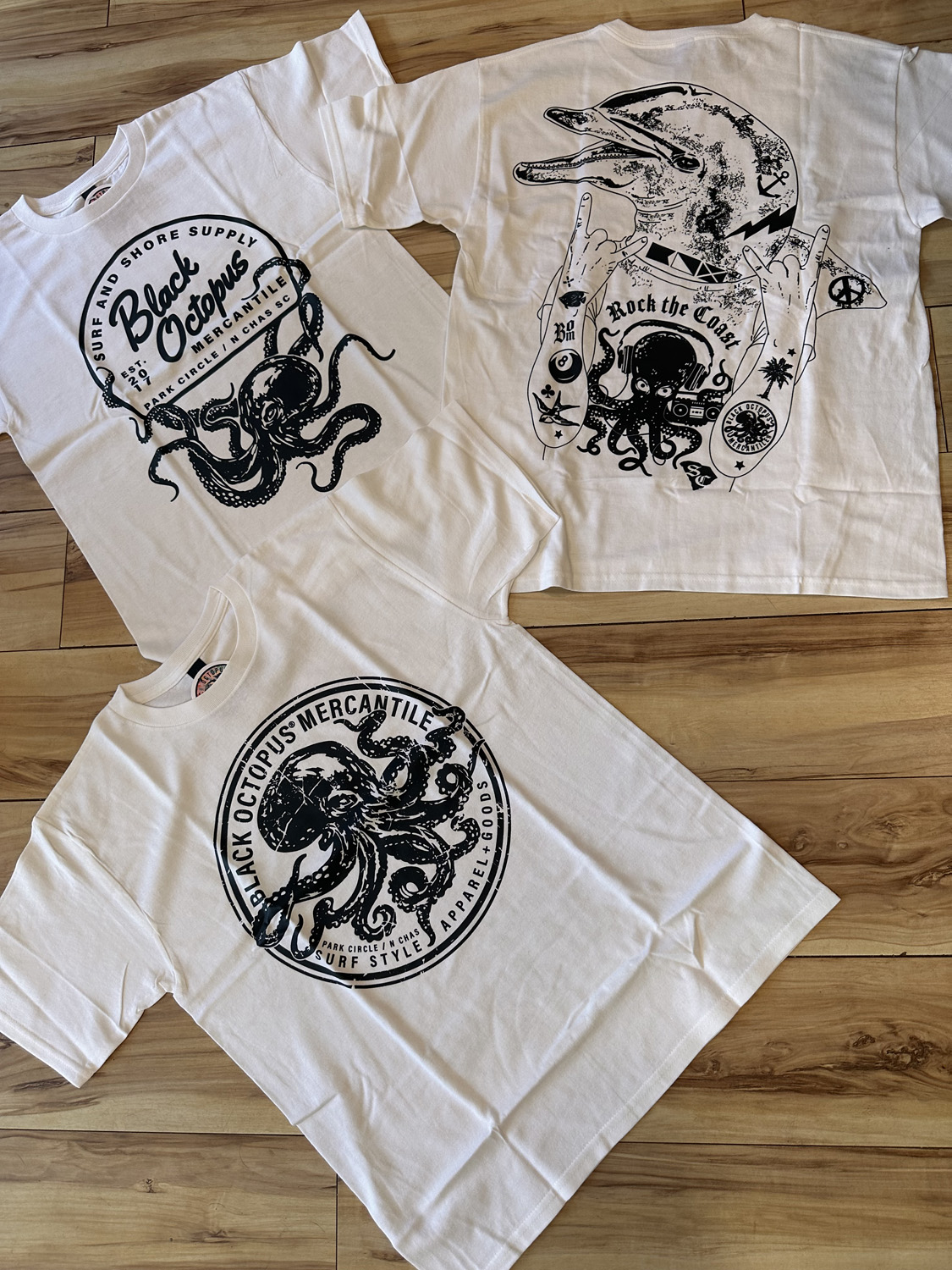 All the apparel is designed and printed by me in the shop and we also stock local coast / SC themed gifts and goods that I also create. From postcards and hats to apparel and more Black Octopus Mercantile is quickly growing into one of Charleston’s best stops for cool & unique one of a kind souvenirs and gifts!